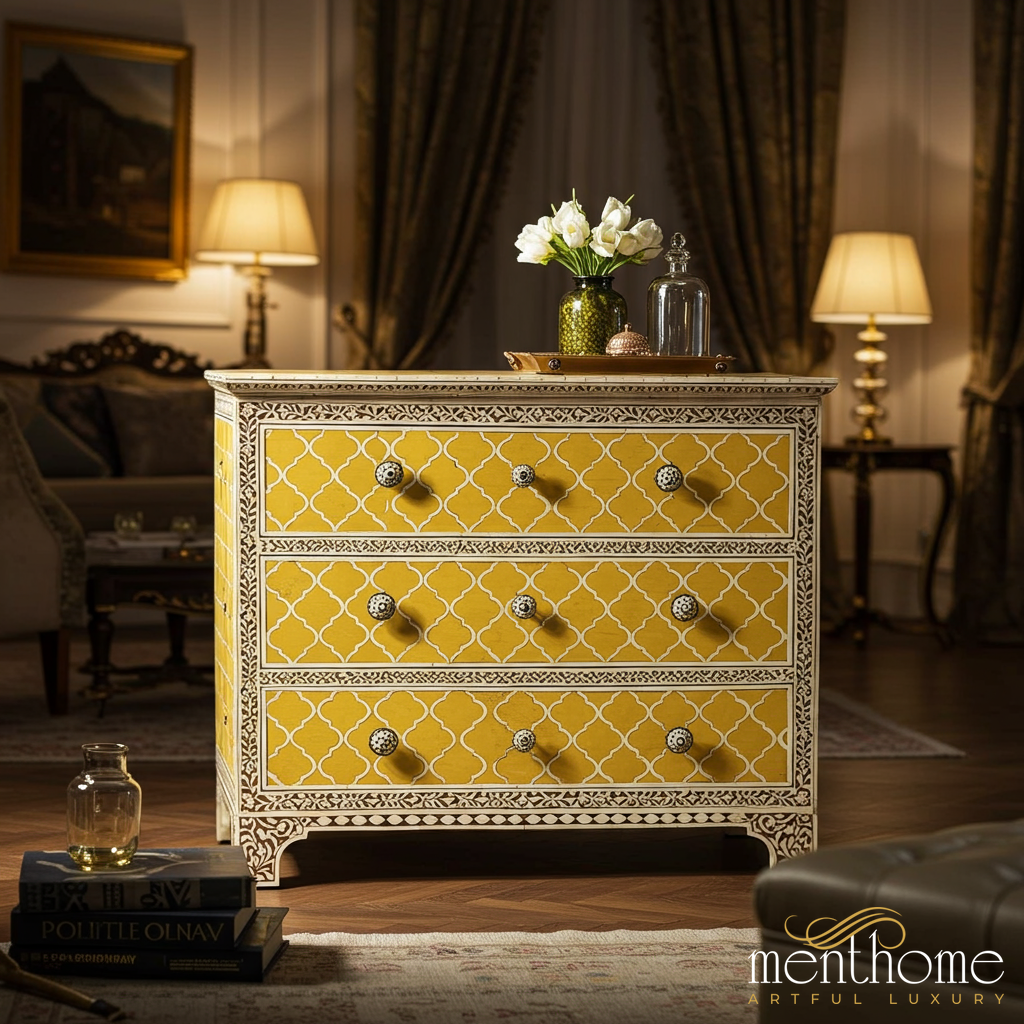 This beautifully crafted vintage wooden dresser features a vibrant yellow patterned design and three spacious drawers. The piece is adorned with intricate floral borders and decorative drawer knobs, making it an elegant addition to any living room or bedroom setting. The dresser offers both functionality and aesthetic appeal, blending traditional artistry with practical storage solutions.